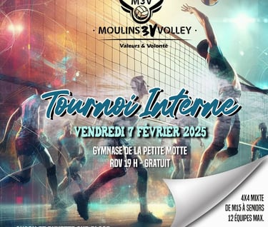 Toujours dans l'optique d'encourager la mentalité d'un club familiale, le club organise son tournoi interne, ouvert à tout les licenciés du club (M15 jusqu'à séniors). Les équipes seront constitués sur tirage au sort et mélangera 1 joueur de chaque section. Snack et buvette seront au rendez-vous. Rendez-vous à 19h00 au Gymnase de la Petite Motte.